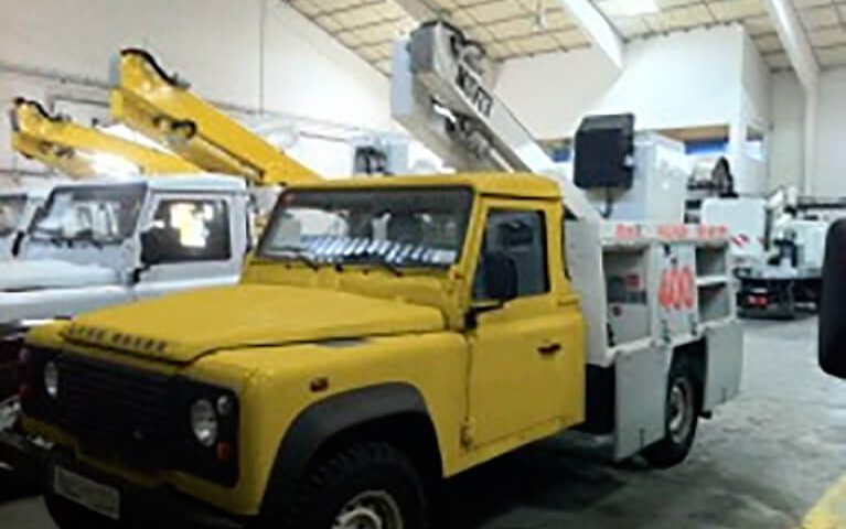 Nacelle élévatrice d’une hauteur de levage de 10,5 mètres, montée sur un Land Rover Defender équipé de casiers sur mesure et ayant un volume de chargement de 600 kg. Véhicule de 32 000 km (2007).